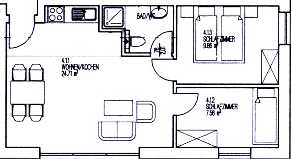 Ca. 45 qm 1-4 Personen Erdgeschoß 1 Wohnzimmer mit Küchenzeile 2 Schlafzimmer (1 mal Doppelbett, 1 mal mit Einzelbetten ) 1 Badezimmer mit Dusche keine Tiere |